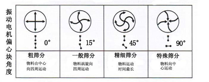 當(dāng)上下偏心塊調(diào)至0度時(shí),物料由中間向四周分散,用來大量篩分粗略的物料。